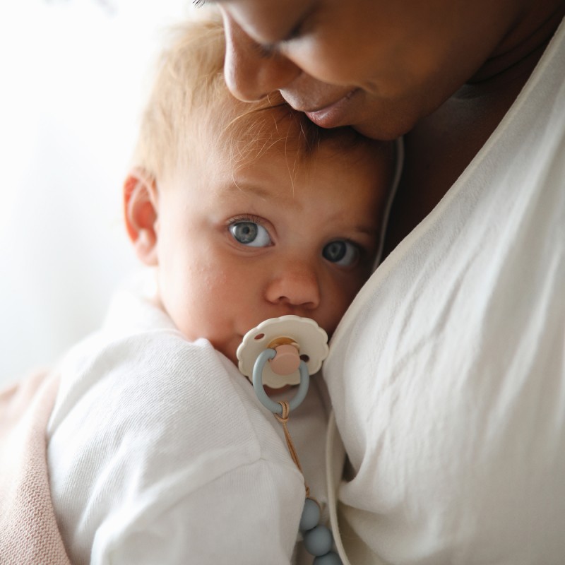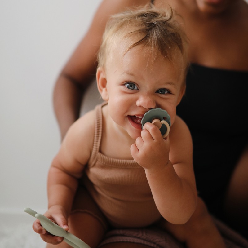 El chupete FRIGG Daisy con bordes adornados que imitan pétalos de flores son la esencia del diseño elegante. Los detalles floridos y modernos llaman la atención de todas las madres preocupadas por el estilo. Eso hace que FRIGG sea la opción perfecta para las madres de hoy que dan gran importancia a los diseños clásicos con toques modernos al elegir artículos esenciales para bebés. El chupete FRIGG Daisy lleno de encanto está disponible tanto en monocromático como en colores mixtos.